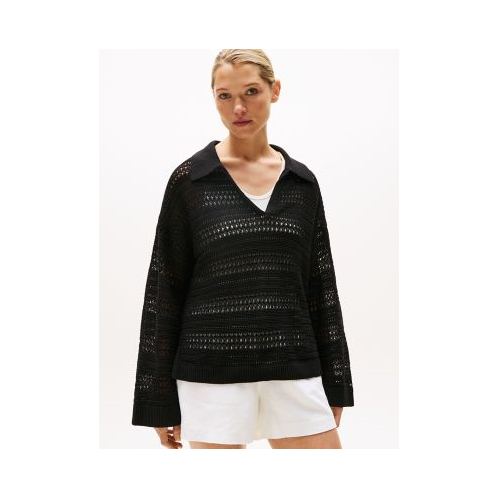 Tommy Hilfiger women's sweater. This relaxed-fit polo sweater is designed in an open crochet stitch for a textured, seasonal look.