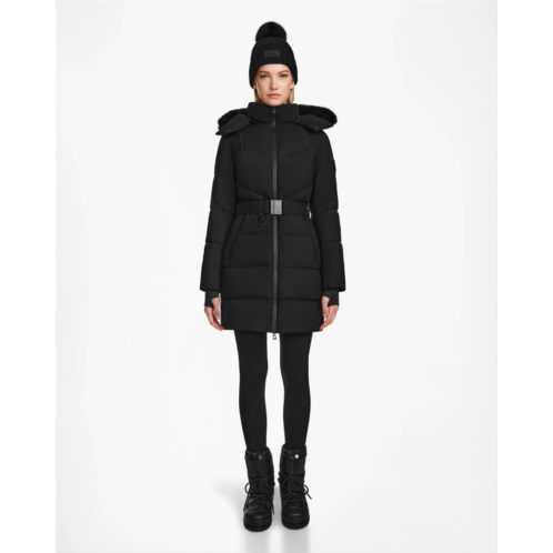 The CHRISTEL M-M by RUDSAK is a women’s mid-length quilted down puffer that combines timeless winter style with high performance. Made from a matte, weather-resistant stretch shell, it features storm cuffs, RDS-certified down fill, and a two-way center front zipper for versatile wear. A removable hood with detachable faux fur, a removable belt, and inner backpack straps for hands-free carrying add function and customization. Designed to withstand cold-weather elements, the CHRISTEL M-M is your essential blend of elegance and comfort for the winter season.