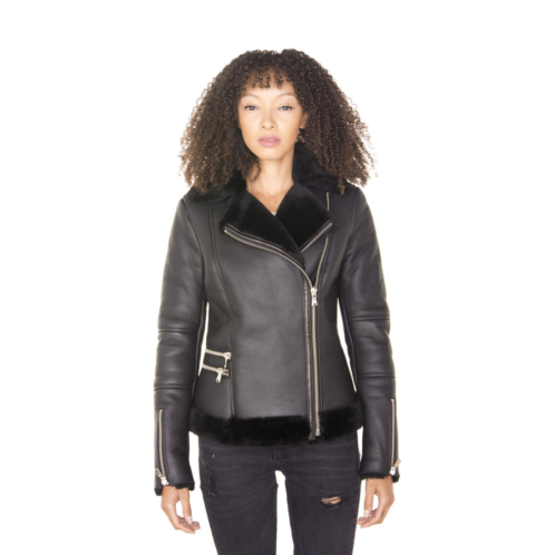 [US] Infinity Leather womens black shearling sheepskin aviator jacket-patchway