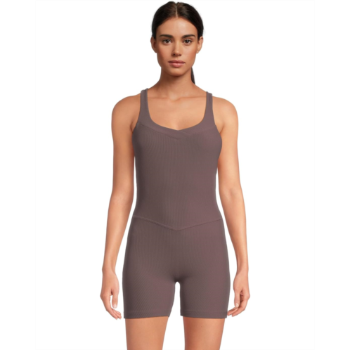 Streamline your routine with the Beyond Yoga Routine Biker Jumpsuit that's ready to keep up with every move. The incredibly comfortable Good Form ribbed fabric of the jumpsuit makes it a must-have. It features comfortable support plus no front seam, so you can stretch, lift, squat, and tackle those goals without worry. Designed with Hugs-just-right compression, a built-in bra, and a racerback design, this high-rise jumpsuit provides great support. It is styled with a front V-neckline with overlapping detail, no front rise seam, and a performance-lining shelf bra. This skinny-leg jumpsuit is uniquely created to flatter every shape.