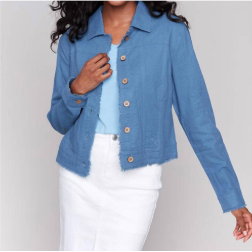 A casual yet cool jacket that every closset needs.Enhance your wardrobe with the Linen Blend Jacket by CHARLIE B, offering a denim blue hue and versatile style. This preppy jacket features long sleeves and a short 20' length, ideal for layering during spring and summer travels. Crafted from 55% Linen and 45% Rayon, it boasts a button closure and handy front pockets, complemented by a chic shirt collar and distinctive frayed edges. Care for this piece by washing delicately in cold water, hanging to dry, and ironing on a low setting for enduring style and comfort.