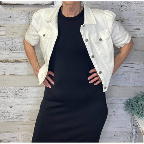 Throw this adorable jacket over just about anything for an effortlessly stylish look.Elevate your denim selection with the Clear Eyes Crop Denim Jacket by Sadie & Sage, crafted in a sleek white hue. This jacket features charming short puff sleeves, a button closure with silver accents, and subtle ease from its 97% cotton and 3% spandex blend. Care for your garment with a machine wash cold and line dry for longevity. Tammy is styled in a medium, standing at 5'8'.