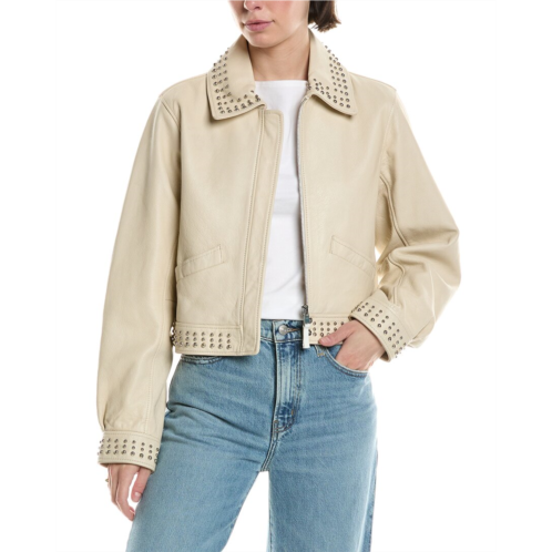 Introducing the Cinq a Sept Kierstin Leather Jacket - a modern and sophisticated addition to your outerwear collection. This ivory leather jacket features two front pockets, a spread collar, snap cuffs, and stud embellishments for a touch of edge. Measuring approximately 20 inches from shoulder to hem, this jacket is designed to flatter all figures. The zipper front closure adds a sleek finish, while the 100% lambskin leather construction ensures a luxury feel. Complete with a 100% polyester lining, this jacket is perfect for transitional weather. Simply clean by a leather expert and enjoy the imported craftsmanship of this stylish piece. Elevate your wardrobe with the Cinq a Sept Kierstin Leather Jacket today.