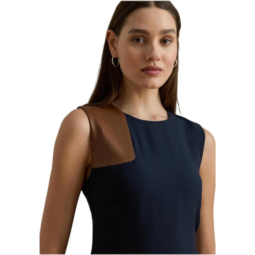 This refined sleeveless dress features fluid double-faced georgette and a sumptuous faux-leather shoulder patch. Featuring an A-line silhouette with a rounded neckline, sleeveless silhouette and a concealed center back zipper with a hook-and-eye closure.
