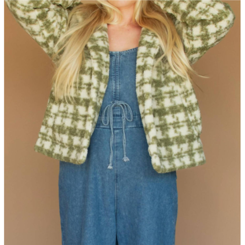 Colder weather means jacket season and we are loving everything about this timeless teddy jacket.Meet the Josie Jacket by Blu Pepper, a chic fusion of fashion and practicality designed for the modern woman. This long sleeve teddy jacket in green features a distinct houndstooth-inspired pattern, adding texture and visual appeal. Originating in an unspecified country, this jacket utilizes a button closure adorned with subtle tortoise shell-inspired buttons for a touch of elegance and easy fastening. While specific care instructions are not provided, its lined interior ensures comfort, and the functional pockets add convenience.