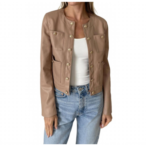 A leather jacket so good, it works with just about any outfit.Introducing the Blair Jacket by SIX/FIFTY, a chic and super soft addition crafted for the modern woman. This tan leather jacket features long sleeves and a button closure, with thoughtful pocket details and button cuffs adding a touch of style. Composed of 100% polyurethane for the self and 100% polyester for the lining, this solid-patterned piece embodies minimalist elegance. Perfect for spring occasions, whether dressing it up with a tunic and skirt or going casual with a tee and jeans. Model is wearing size S.