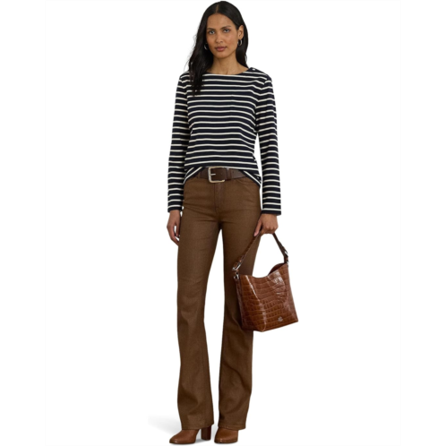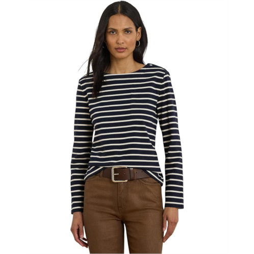 Yarn-dyed horizontal stripes punctuate the relaxed-fitting silhouette of the Lauren Ralph Lauren Striped Jersey Snap-Trim Boatneck Top, which is made from soft plaited jersey. The 'LRL'-engraved snaps at the shoulders and an embroidered logo at the hem complete the look. It is styled with long sleeves, dropped shoulders, a boat neckline, and a straight hem.