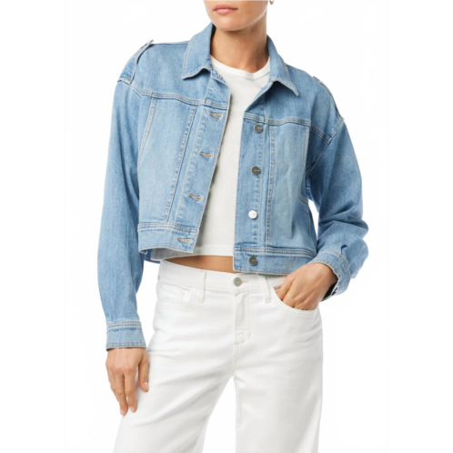 The perfect jean jacket for those slightly crisper days between seasons.Introducing the Utility Boxy Jacket by Joe's Jeans, the perfect statement piece in a medium-light blue wash. This jean jacket, crafted from a cotton blend of 99% Cotton and 1% Elastane, features long sleeves and a button closure. Complete with a boxy silhouette, collar neckline, and detailed shoulder epaulets, it's an ideal addition to any wardrobe for travel or fall occasions. Care instructions are not provided, and the model is wearing a size small.