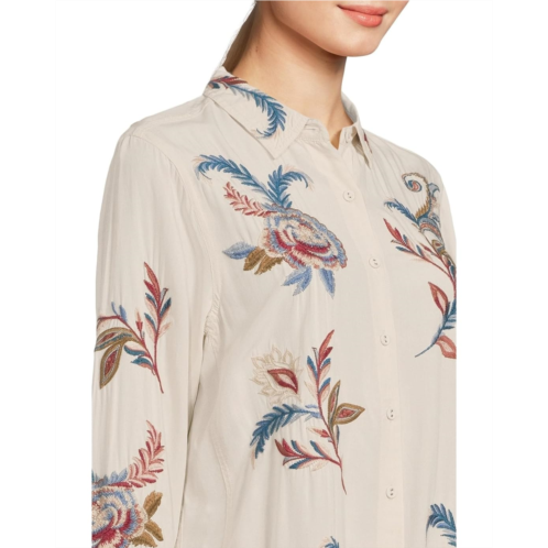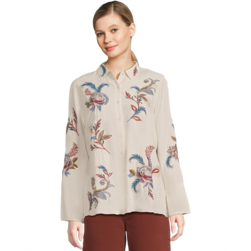 Effortlessly chic and timelessly bold, the Johnny Was Vintage Button Down Shirt is your wardrobe's instant upgrade. Crafted from lightweight fabric that drapes with ease, this shirt blends everyday comfort with statement-making style. The collared neck and button-front closure lend a classic touch, while the long sleeves with split buttoned cuffs offer versatile wear, whether rolled up for a relaxed vibe or styled neatly for polish. What truly sets this piece apart is the vibrant embroidered detailing, an artful finish that transforms a staple into a showpiece. Covered buttons complete the design with an elevated, vintage-inspired charm, making it perfect for dressing up denim, layering over skirts, or pairing with tailored trousers.