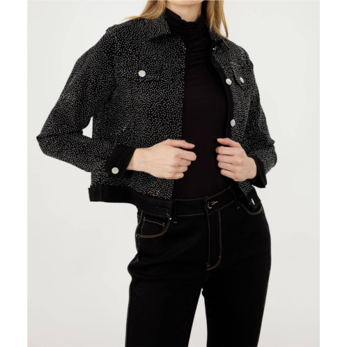 Throw this adorable jacket over just about anything for an effortlessly stylish look.Introducing the Frank Lyman Woven Jacket in Black/Silver, a chic addition to any wardrobe. This piece features long, straight sleeves and a practical waist-length cut with a playful polka dot pattern, while a classic collar and button closure add an elegant touch. Made of 75% Polyester, 23% Polyester, and 2% Elastane, it includes convenient pockets for added functionality. Care for this jacket with hand washing and laying it flat to dry, measuring approximately 24 inches in length.