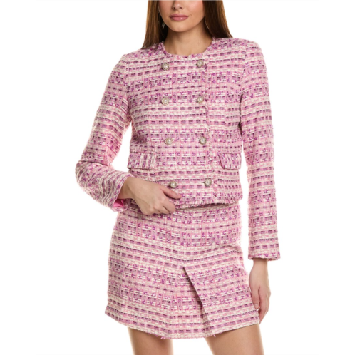 Introducing the Flora Bea NYC Tamara Coat in Cherry Pop. This stylish coat features a metallic tweed design, dual front pockets, and a double-breasted button front closure. Made from 100% polyester, this coat is both fashionable and functional. The Tamara Coat is approximately 18.5 inches from shoulder to hem and is available in various sizes. Perfect for chilly days and evenings, this coat is a must-have addition to your outerwear collection. Dry clean only. Imported.