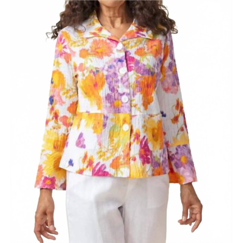 Cute, casual, and comfortable. This jacket is a must have.Elevate your beach day look with the Sunflower Patch Flounce Jacket by Habitat, a blend of practicality and femininity in vibrant floral patterns. Designed with long sleeves and a flattering collar, this casual jacket adds a swing to the hem and sleeves, enhancing its feminine touch. Crafted from high-quality cotton, it features a convenient button closure. Ideal for the maximalist trend, this unlined piece is perfect for the spring season.