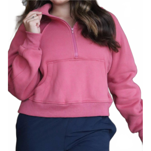 Cooler temps call for layering and we love this adorable sweatshirt for all the obvious reasons.Introducing the Women's Funnel Neck Half Zip by AEMI + CO, a stylish and comfortable addition to your streetwear collection. This berry-colored sweatshirt features long sleeves, an oversized fit, and a cozy funnel neckline for ultimate comfort. Designed for versatility, it includes convenient pockets and a pull-on closure. Perfect for vacation and everyday wear, this piece effortlessly blends into your fall wardrobe.