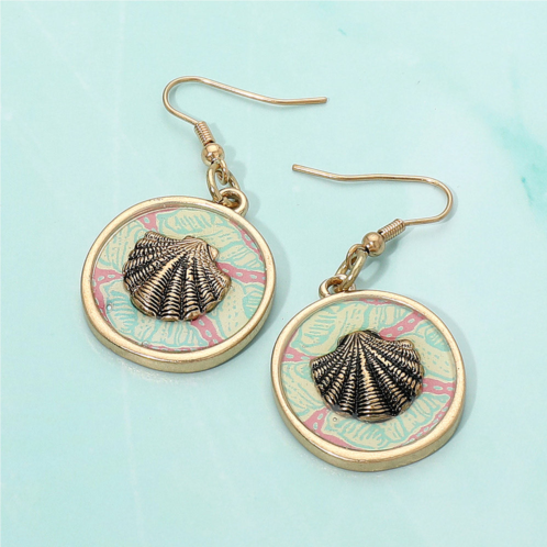 Size - 1' X 1.75'Fish Hook BackCharming round dangle earrings featuring a textured shell motif on a decorative background. Lightweight and beach-inspired, perfect for adding a coastal touch to any casual or vacation look.