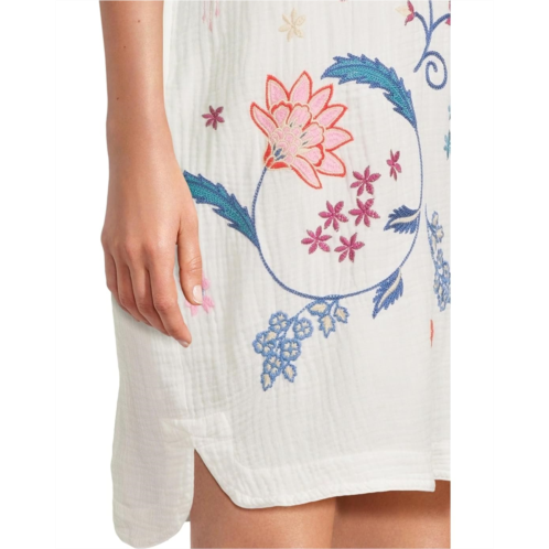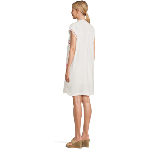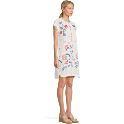 Breezy, boho, and beautifully bold: Johnny Was Mishti Dress (lined) - Elena. This white, tunickorea beauty features colorful florals and birds that flutter across the fabric in vibrant pinks, corals, and blues. The split neckline with decorative trim, relaxed classic fit, and short cap sleeves offer an easy-breezy silhouette you can simply pull on and go. Finished at a flattering knee length with hidden pockets for function without fuss, it's the ultimate warm-weather essential.