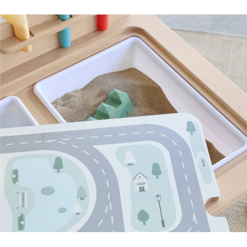 Inspire their imaginations and encourage exploration with our interactive table. Underneath the removable roadmap top, it has three bins to fill with fun-to-touch materials like water, sand, buttons, balls or fabrics. A built-in rack holds a spade, shovel and rake stirring, living and shaping. Crafted of kiln-dried wood with a wipe-clean finish, it’s built for countless hours of active play.