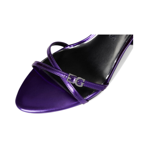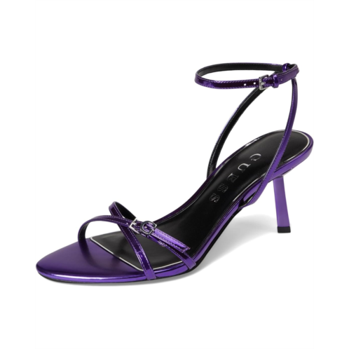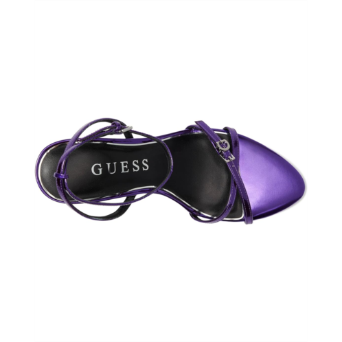 Make a grand entrance styling GUESS Connee. Designed to steal the spotlight, this strappy dress sandal brings together sleek sophistication and all-day comfort. Crafted with a smooth leather upper and secured by an ankle-wrap buckle closure, it ensures a perfect fit while the open toe keeps the look chic and versatile. The front strap is elevated with the signature metal 'G' ornament, a subtle nod to GUESS heritage style. A sculpted metal stiletto heel adds wearable height, making every stride confident and striking. Inside, a plush cushioned insole delivers lasting support, while the flex outsole moves seamlessly with you, ensuring comfort doesn't take a backseat to style.