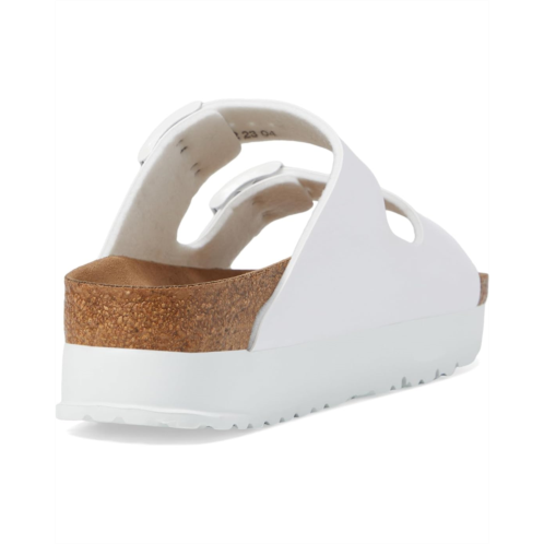 - Walk the toughest paths while being super comfortable wearing Birkenstock Papillio by Birkenstock Arizona Platform Sandal - Vegan Flat Sandals. This slip-on footwear features a Birki-Flor synthetic upper construction with buckled straps, microfiber lining, and EVA cushioning cork footbed.