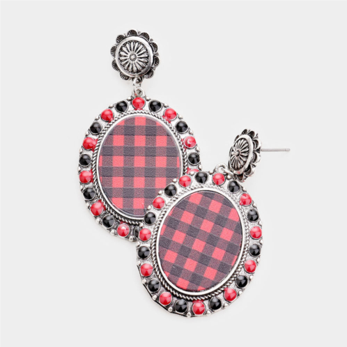 [US] FASHNZFAB buffalo check print colored polka dot trim metal oval dangle earrings
