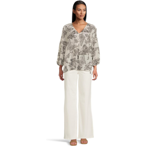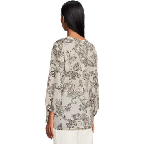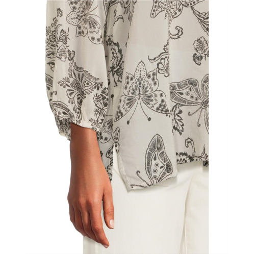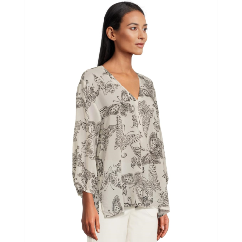 Graceful and lightweight, this flowy blouse features a beautifully detailed butterfly print on a soft background. The relaxed silhouette is complemented by a flattering V-neckline and billowy three-quarter sleeves with gathered cuffs. Effortlessly chic and endlessly versatile, it's a dreamy piece that pairs perfectly with both casual and elevated looks.