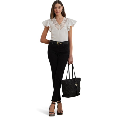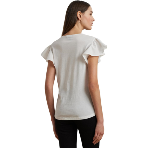 Whimsical flutter sleeves, ruffle trim and lace insets amplify the feminine allure of this breezy LAUREN Ralph Lauren Lace-trim Jersey Flutter-sleeve Tee, which is crafted with lightweight cotton-blend jersey. Ralph Lauren partners with Better Cotton to improve cotton farming globally. Designed in a relaxed fit that hits at the hip, this top features a ruffle-trimmed keyhole neckline with a delicate button-and-loop closure, finished with an LRL-engraved pearlised button. Lace insets at the front yoke add a romantic touch, while subtle shirring at the front and back yoke seams enhances its airy silhouette. A charming piece that blends softness, comfort and refined detailing for everyday elegance.