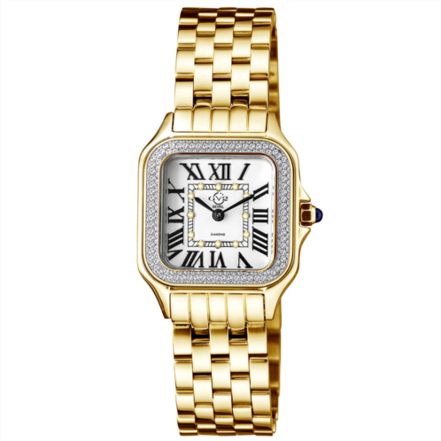GV2 12112B Women's Milan Diamond Swiss Quartz WatchGV2 Women's Swiss Watch from the Milan Collection27.5 mm Square IP Light Yellow Gold Case/Push Pull Crown with Blue Cabochon StoneDiamond Cut Bezel, Crisp White Dial with 12 DiamondsIP Light Yellow Gold Bracelet With Deployment BuckleSapphire CrystalWater Resistant to 50 Meters/5ATMSwiss Quartz Movement Ronda 762