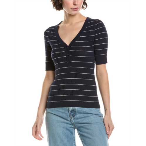 Introducing the A.L.C. Francis Top, a must-have addition to your wardrobe this season. This bold and modern top features a stylish navy stripe design and is made from a comfortable ribbed fabric. The V-neck and button placket add a touch of sophistication to this versatile piece. Made of 78% cotton and 22% nylon, this top is both stylish and easy to care for - simply dry clean only. Imported and approximately 23 inches from shoulder to hem, the A.L.C. Francis Top is the perfect combination of style and comfort. Elevate your wardrobe with this wearable piece from A.L.C.