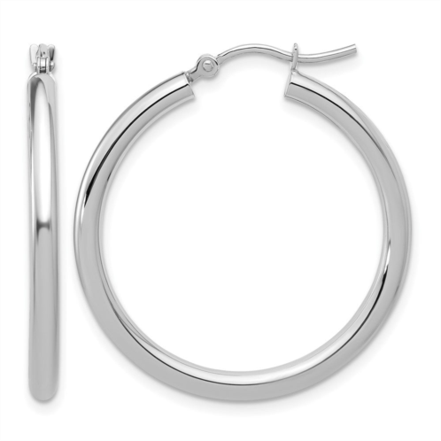 Elevate your everyday style with these 14K white gold lightweight hollow hoop earrings. Crafted with precision from tubing, these earrings feature a polished finish and rhodium plating for added shine and durability. The hollow design makes them exceptionally lightweight and comfortable for extended wear, while the secure wire & clutch closure ensures they stay in place.