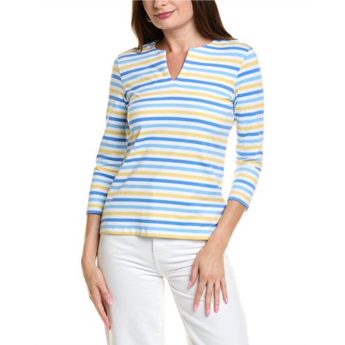 Introducing the J.McLaughlin Carly Catalina Cloth Top, a stylish addition to your wardrobe. This top features a blue and yellow bangle stripe design, perfect for adding a pop of color to any outfit. With 3/4-length sleeves and a length of approximately 23.5 inches from shoulder to hem, this top is both comfortable and flattering. Made from 91% nylon and 9% spandex, this top is easy to care for with a hand wash recommended. Whether you're dressing it up for a night out or keeping it casual for the weekend, this top is sure to become a favorite in your wardrobe. Model is 5'10.5 and is wearing a size small. Please note that measurements may vary slightly by size. Imported. Choose J.McLaughlin for traditional sportswear with stand-out fabrics and prints.