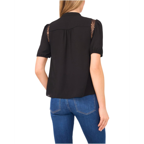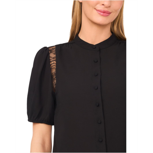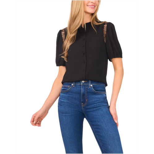 [US] CeCe Short Sleeve Button Front Lace Trim Top