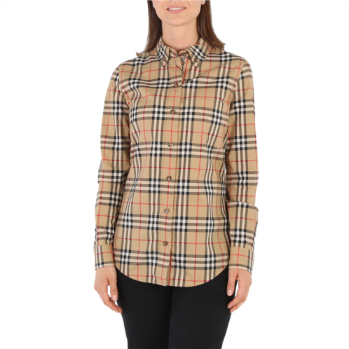 Burberry Ladies Tops. Fashion category - Casual Button-Downs. SKU - 8022284. Color - Archive Beige. Burberry Ladies Vintage Check Stretch Cotton Button-down Collar Shirt. This Burberry slim-fit shirt is crafted in stretch cotton twill with the brand's Vintage check. This shirt features a front button fastening, button-down collar, long sleeves, single-button cuffs, a curved hem and 1 chest patch pocket. Material - 95% Cotton, 5% Elastane.