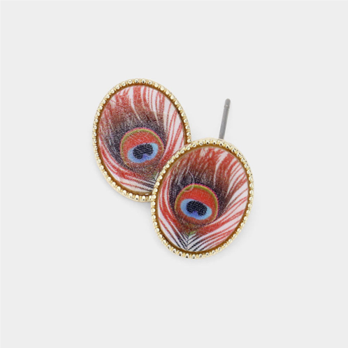 [US] FASHNZFAB feather printed oval mother of pearl stud earrings