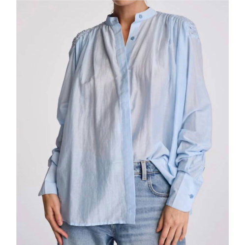 This button down shirt is comfortable yet polished.Sophisticated take on the classic button-up in serene sky blue. Crafted from an exquisite 80% cotton and 20% silk blend. Offers a breathable, luxurious feel. Featuring a refined diamond pin tuck on the back placket. Seamlessly blends style and elegance for your spring workwear ensemble. Button closure. Delicate wash cold, tumble dry low. Model is wearing a size XS (5’10” height, 32” bust, 25” waist, 35” hips).