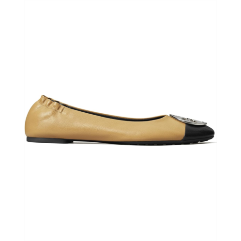 - When you wish to embrace an iconic and elegant style without skimping on comfort, look no further than the Tory Burch Claire Cap-Toe Ballet Flats. Adorned with a sleek metallic logo emblem on the two-tone leather upper, the round-toe shoes come in an easy slip-on style with a stretchy heel counter for a comfortable fit.
