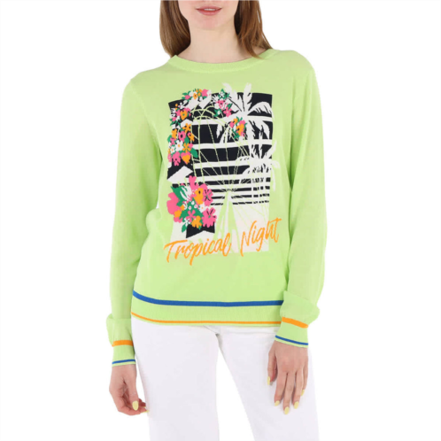 J-WON Tropical Pullover in Green, . SKU - JWSS19-K03003-52JQ. Color - Green. J-Won Tropical Pullover in Green. Crafted from cotton, this sweatshirt from Jwon features long sleeves, ribbed cuffs, round ribbed neck, stripe details at the hem and cuffs and a embroidered design on the front.
