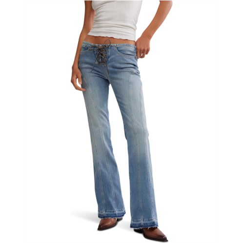 The Free People Dust In Glory Flare jeans is a vintage-inspired essential designed to make a statement. This low-rise bottomwear features a straight fit silhouette that elongates the legs. The classic five-pocket styling and a lace-up closure add timeless utility.