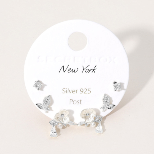 [US] FASHNZFAB secret box_925 sterling silver post stone paved pearl flower 3 pairs stud earring set