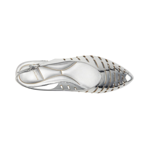 Kenneth Cole New York Calabra is perfect from day trips to romantic evening strolls. Crafted from leather upper, and synthetic lining, this pair of sandals features a pointy peep toe and geometric perforations create a futuristic aesthetic on a metallic slingback flat set on a cushioned footbed and barely-there block heel.