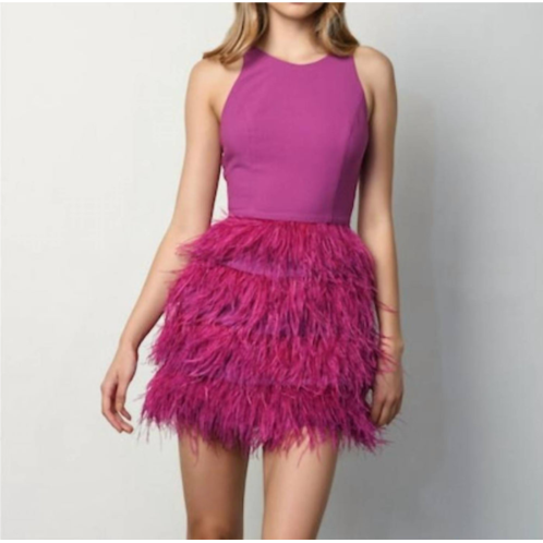 A short and breezy dress for those warmer days.Crepe combo mini dress with feather skirt. Squared v back detail. Center back zipper. 32' from HPS. Dry clean only.