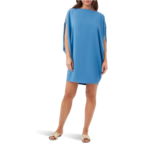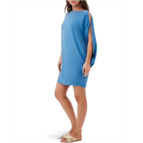The Trina Turk Razu dress is an easy shift silhouette with open sleeves and gold hardware. This stylish dress features a high boat neckline, dolman split sleeves, and a flattering curved hem.