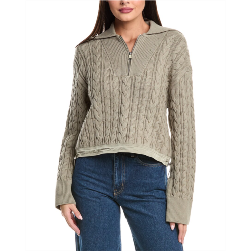 Introducing the SIMKHAI Lourdes Wool-Blend Pullover, a cozy and stylish addition to your wardrobe. This cable knit pullover features a chic sage color, spread collar, and ribbed trim for a modern look. The 1/4-zip closure adds a unique touch, while the blend of 85% cotton and 15% wool ensures both warmth and comfort. The contrasting 100% polyester detail adds a pop of texture. Perfect for cooler weather, this pullover is approximately 25 inches from shoulder to hem and is designed to flatter all body types. Pair with your favorite jeans or leggings for a casual yet elevated outfit. Dry clean only. Imported. Model is 5'9 and is wearing a size small. Measurements may vary slightly by size.