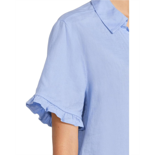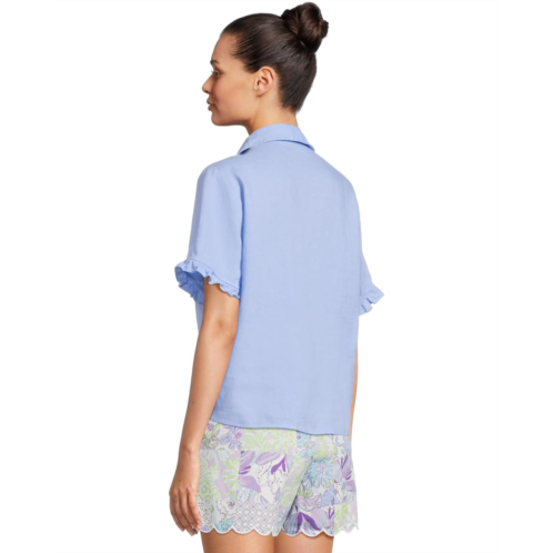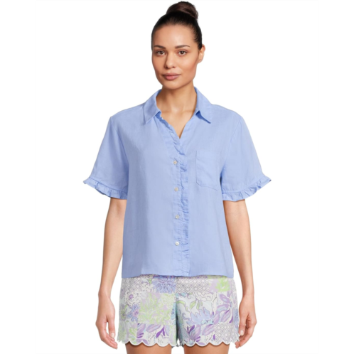 Exude simple and sophisticated vibes wearing Lilly Pulitzer Carden Ruffle Top, a collared shirtkorea top in a standard-length silhouette. The button-front top features short sleeves with ruffled ends, a patch pocket on the left chest, ruffled detail at the center-front, and a straight hem.