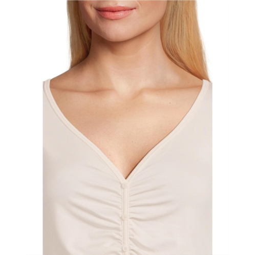 The Splendid Yasmina Ruched Tee beautifully blends timeless elegance with modern comfort. The pull-on style top features short sleeves with round-cut cuffs and shirring at center front to create a V-neckline. The center-front button closure features decorative, non functional buttons.