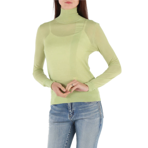 Burberry Ladies Tops. Fashion category - Cardigans & Sweaters. SKU - 8043382. Color - Mist Green. Burberry Ladies Mist Green Monogram-Embroidered Knitted Jumper. A wool-mulberry silk blend jumper featuring knitted construction, high neck, long sleeves, straight hem and an embroidered logo. Wool 70%, Mulberry Silk 24%, Cashmere 6%