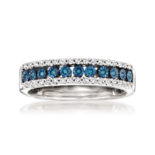 Ross-Simons travels the world to find beautiful, high-quality styles at the best prices. Some drama for your stack! Our beautifully bold ring dazzles with 0.25 ct. t.w. round white and blue diamonds in an eye-catching three-row design. Crafted in polished sterling silver. Blue rhodium. 3/16' wide. Blue and white diamond ring. Our blue diamonds are natural diamonds that have been treated which causes the color change and then heated to hold the color. The color change process is permanent. Each Ross-Simons item arrives in a fine jewelry presentation box. Shop Ross-Simons jewelry risk-free as all items include a 30-day, 100% money-back guarantee.