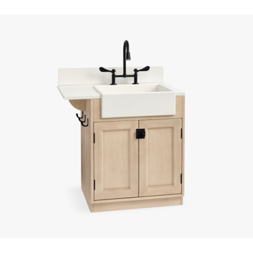 - Sink features farmer’s sink, hooks on side for towels, area for dishes on top and doors with a roomy interior for storing items.