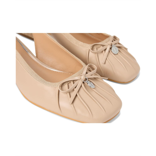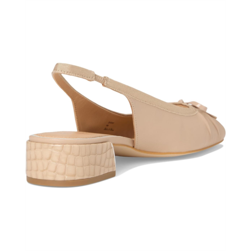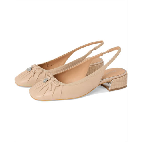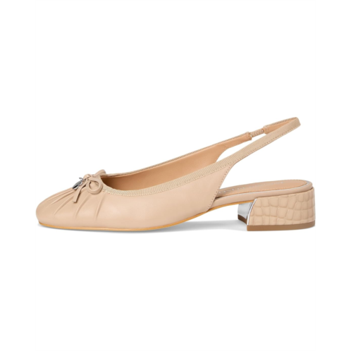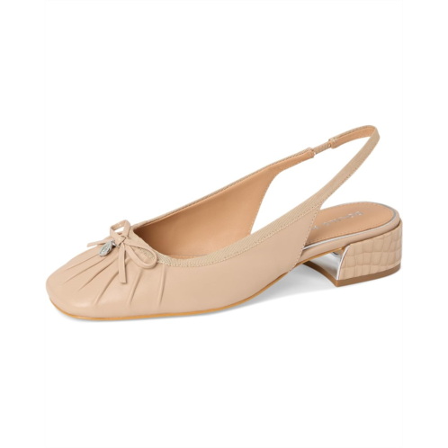 Move better and smarter wearing the Donald Pliner Darah. Crafted from ruched leather upper, lining, and insole, this pair of sandals features square toe, feminine bow and DP charm ornament, and block heel with electroplated detail.