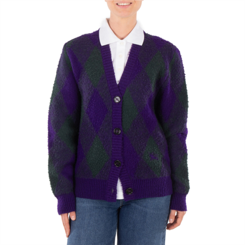 Burberry Ladies Tops. Fashion category - Cardigans & Sweaters. SKU - 8076954. Material - Wool. Color - Royal Ip Pattern. Burberry Argyle-Intarsia-Knit V-Neck Wool Cardigan. This cardigan features an argyle intarsia knit design, an intarsia-knit logo, a ribbed V-neck, front button fastening, drop shoulders, long sleeves, and ribbed cuffs and hem. 100% Wool. Made in Italy.