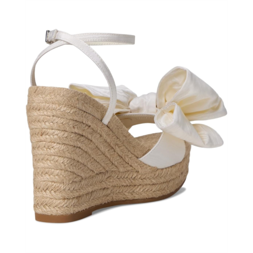 The Loeffler Randall Angelina Bow Wedge sandals are espadrille wedges in cream with a bow detail. They feature a raffia footbed with a gold-stamped logo and an open, almond-shaped toe. These heeled sandals are crafted with a cotton upper with a leather lining. Their ankle strap with an adjustable buckle closure offers a secure fit. Style up your outfits and dresses with these wedge sandals.
