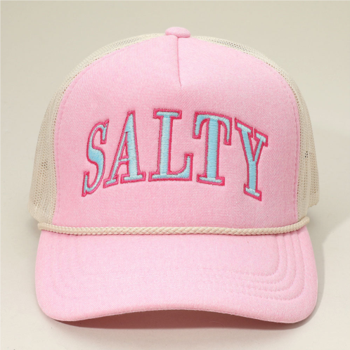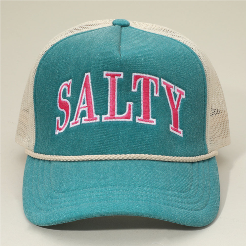 Crown Circumference - 23'Crown Height - 4.5'Brim Width - 2.5'Material - 55% Cotton, 45% PolyesterShow off your beach attitude with this “Salty” trucker hat in vibrant color, featuring bold embroidered lettering and a breathable beige mesh back. Perfect for sun-soaked days, coastal road trips, or laid-back weekends. Adjustable snapback for a relaxed and comfortable fit.